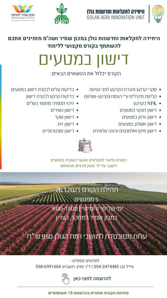 קורס דישון במטעים 11/01/2023 חדשות ועדכונים, מטעים Share This Tweet Share Pin It Share מנהל האתר עוד מאמרים מעניינים הלוחש לעגבניות באמצע מישור הבזלת שמתחת למושב שעל, בין עדר כבשים מנומנם למטעי הנשירים מתגלה לי מתחם… התנדבות בחוות היישום באבני איתן: התחדשות, פריחה וטכנולוגיות מתקדמות חוות היישום באבני איתן נמצאת בחודשים האחרונים בתנופת התחדשות. בחווה הוקמו חממות חדשות ומתקדמות בהן… גידול תות שדה בחוות היישום באבני איתן גידול תות שדה בחווה נעשה במצע מנותק בתוך גרובגים של קוקוס נקי, של מרום גולן,…