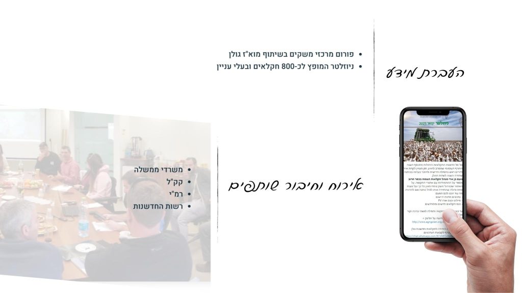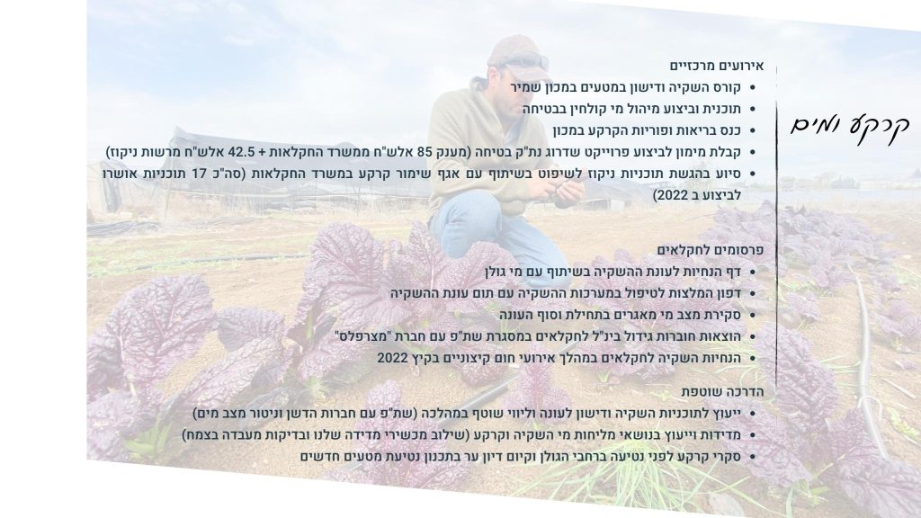 סיכום 2022 ביחידה 13/02/2023 חדשות ועדכונים Share This Tweet Share Pin It Share מנהל האתר עוד מאמרים מעניינים הלוחש לעגבניות באמצע מישור הבזלת שמתחת למושב שעל, בין עדר כבשים מנומנם למטעי הנשירים מתגלה לי מתחם… התנדבות בחוות היישום באבני איתן: התחדשות, פריחה וטכנולוגיות מתקדמות חוות היישום באבני איתן נמצאת בחודשים האחרונים בתנופת התחדשות. בחווה הוקמו חממות חדשות ומתקדמות בהן… גידול תות שדה בחוות היישום באבני איתן גידול תות שדה בחווה נעשה במצע מנותק בתוך גרובגים של קוקוס נקי, של מרום גולן,…
