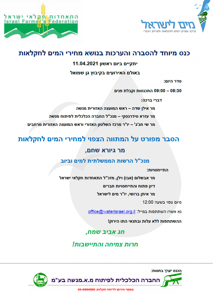כנס מיוחד להסברה והערכות בנושא מחירי המים לחקלאות
